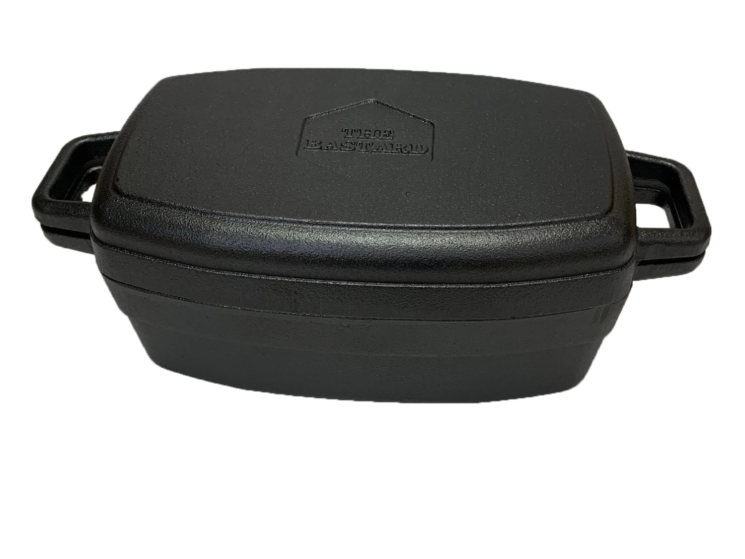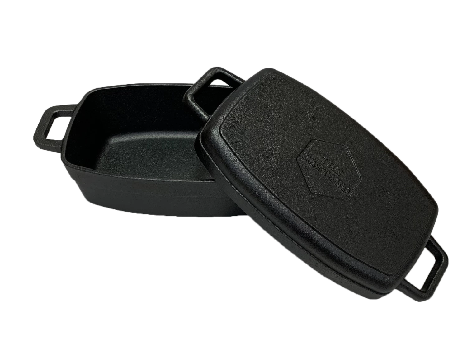 De The Bastard Bread Pan is een rechthoekige braadpan gemaakt van pre-seasoned, voorbehandeld, ongeëmailleerd gietijzer. De broodpan heeft inclusief de grepen en de deksel een lengte van 35 cm, een breedte van 17 cm en een hoogte van 9 cm. Geschikt voor de Bastard Medium, Large en Extra Large. De broodpan is bestand tegen hoge temperaturen en is geschikt voor gebruik op gas en elektrische fornuizen, kampvuren en barbecues. De broodpan kan wat oneffenheden aan de onderzijde hebben, hierdoor raden wij het gebruik op glazen kookplaten, zoals keramische en inductiefornuizen af. Gebruik de Bread Pan voor het bakken van brood of bijvoorbeeld voor kippendijencake, meatloaf of brisketbroodjes.